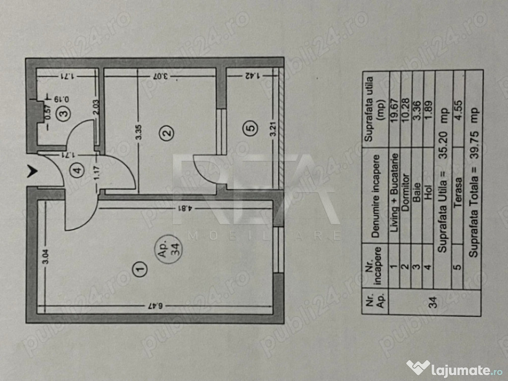 Detine o suprafata totala de 55mp din care utili 50mp si un balcon de 5mp.