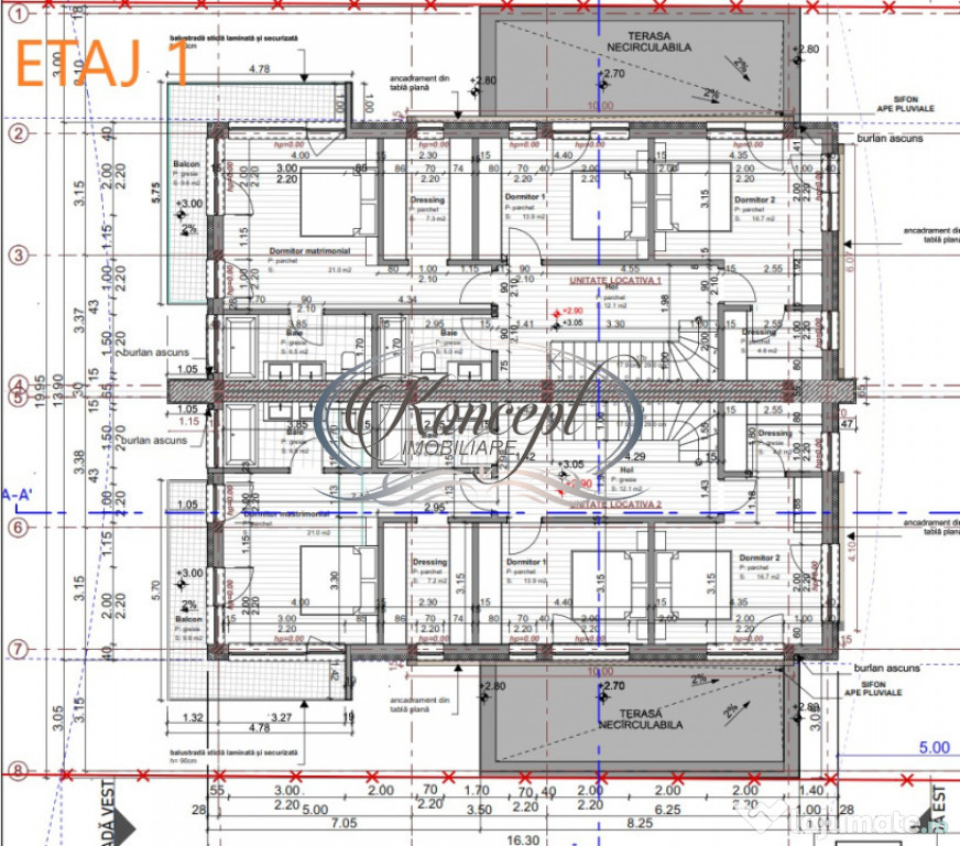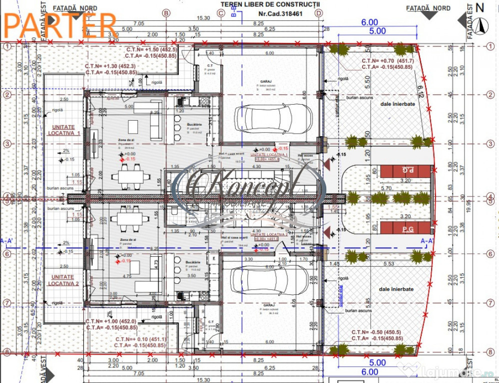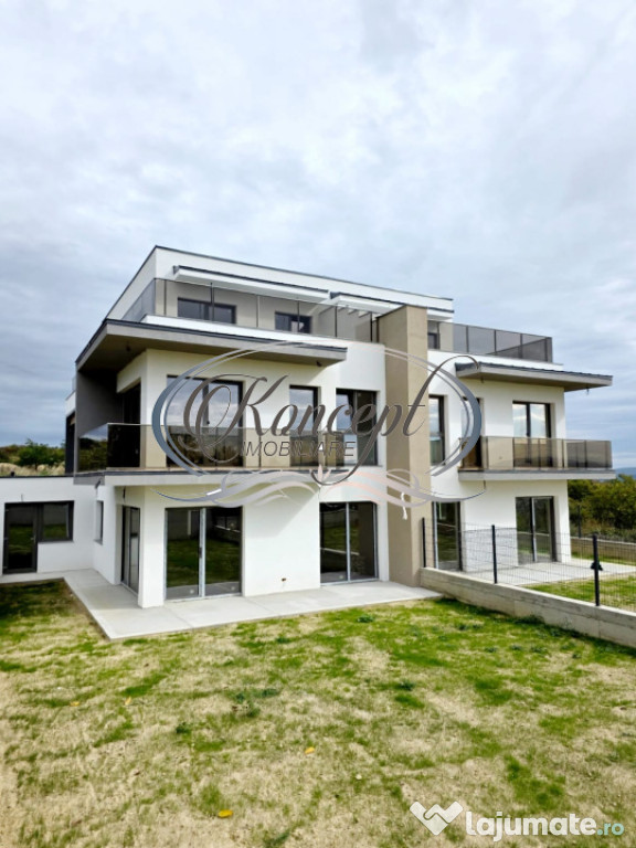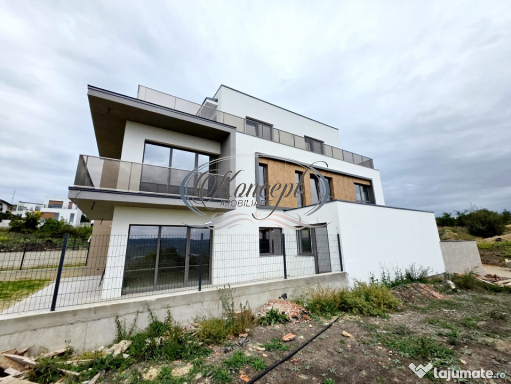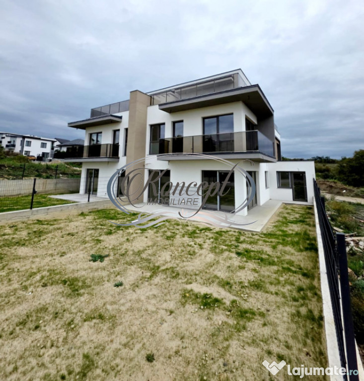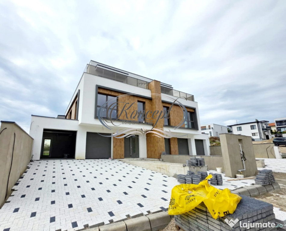 Koncept Imobiliare ofera spre vanzare un duplex premium situat in zona Voronet, intr-o locatie selecta, inconjurata de natura si aer curat, cu acces facil catre principalele artere si puncte de interes ale statiunii. Pozitionarea ofera un echilibru perfect intre liniste si proximitatea facilitatilor, fiind ideala pentru rezidenta permanenta sau casa de vacanta moderna. Imobilul, construit pe un teren de 365 mp, are o suprafata utila de 240 mp si este dispus pe trei niveluri (parter, etaj si etaj retras cu terasa rooftop). Casa este compusa din 5 camere spatioase, 4 bai complet finisate, bucatarie, hol, doua dressing-uri walk-in, spatiu tehnic si garaj dublu. Proprietatea dispune de terasa generoasa de 60 mp si curte privata de 265 mp, perfect amenajabila pentru relaxare sau petreceri in aer liber. Duplexul este oferit la stadiul de semifinisat, cu incalzire in pardoseala alimentata de centrala termica proprie si orientare mixta, asigurand confort termic pe tot parcursul anului. Constructia are regim de inaltime P+1+Etaj retras si include elemente arhitecturale moderne, ferestre mari pentru luminozitate naturala si materiale premium – glafuri de granit, garaje finisate cu pardoseala din quartz si lavabil alb, usi automatizate si iluminat exterior complet (lampi si benzi LED integrate). Proprietatea este destinata in special familiilor care cauta o locuinta de top, eficienta si sigura, dar si celor care apreciaza independenta energetica si tehnologiile sustenabile. Sistemul fotovoltaic de 5 kW, acumulatorii de 5 kW si invertorul trifazic hibrid de 10 kW asigura costuri minime de intretinere si autonomie energetica superioara. Cladirea este certificata energetic nZeb (nearly Zero-Energy Building), cu clasa A, bransament electric trifazat si trasee pregatite pentru aer conditionat, camere de supraveghere, internet in fiecare camera si statie de incarcare pentru masina electrica in garaj. Pentru informatii complete, programarea unei vizionari sau pentru a afla oferta noastra completa va stam la dispozitie telefonic, prin e-mail sau la sediul agentiei noastre, pe str. Aviator Badescu, nr. 19, Cluj-Napoca.Id intern: P20852