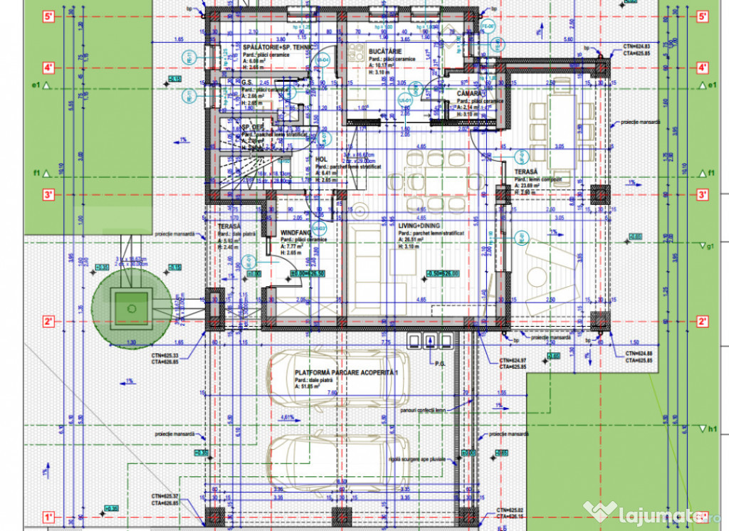 Parter: living cu zonă de dining și acces la terasă, bucătărie închisă, baie, spațiu tehnic/spălătorie