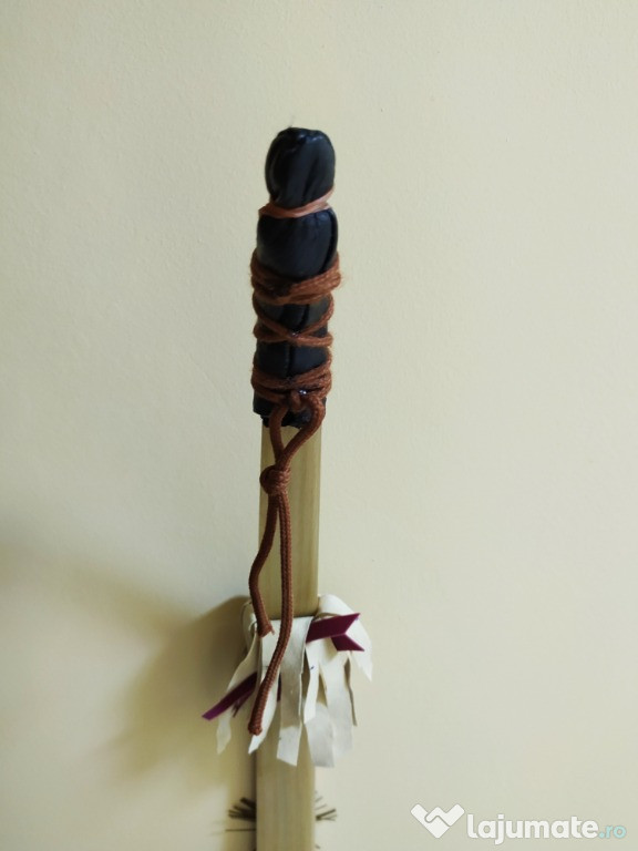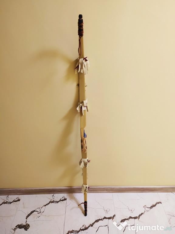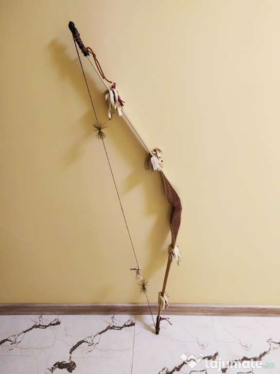 4. Suplimentar am dorit să-i imprim o notă tribală care a îmbunătățit silențiozitatea și eliminarea oricăror vibrații (am montat pe brațe amortizoare franjurate din piele de căprioară) și protecția corzii la vârfurile arcului (protejate cu capișoane din piele naturală ancorate cu șnur cu miez sintetic);