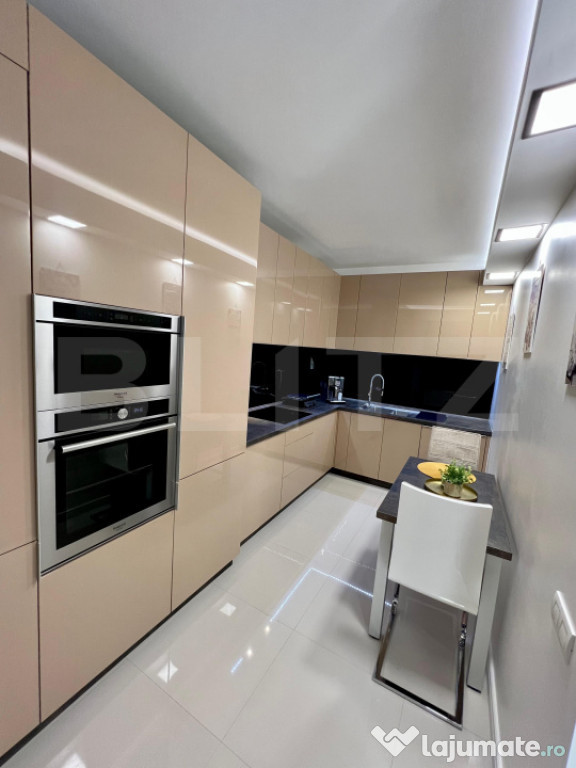 Bucătărie modernă, complet mobilată și utilată, cu electrocasnice încorporate și finisaje lucioase în tonuri calde de bej și negru;