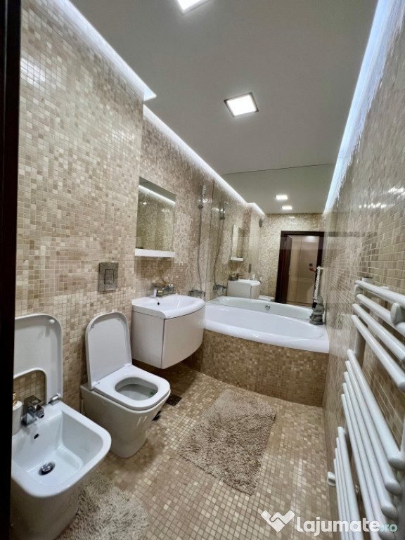 Baie elegantă, finisată integral cu mozaic de marmură, dotată cu cadă, baterii Grohe și iluminare ambientală;