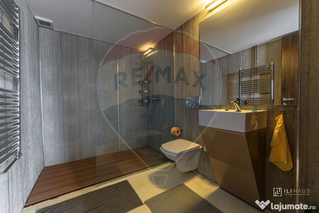 Baie modernă cu walk-in shower și finisaje de calitate