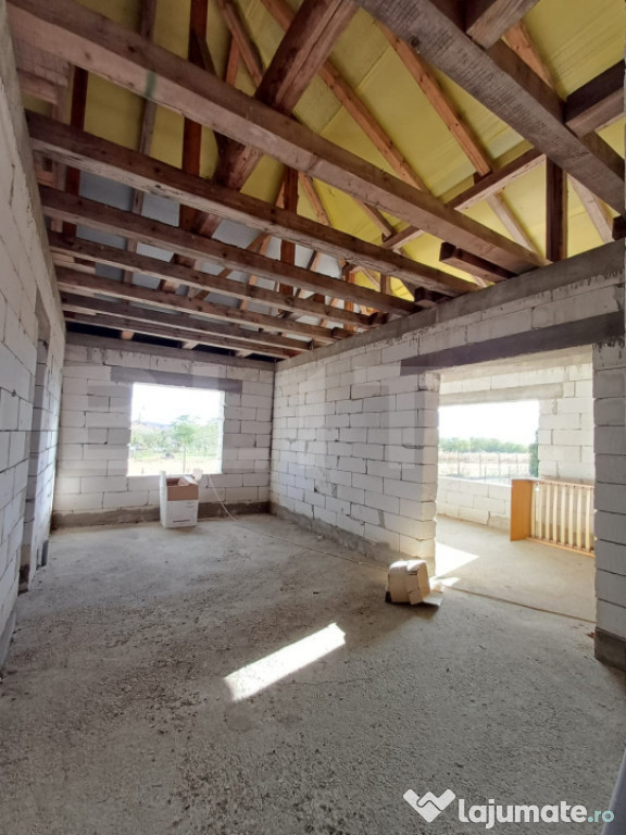 Casa 2: are o suprafata construita de 106 mpsi este formata din antreu spatios, bucatarie, living, 2 camere, 2 bai si camara. Are geamuri si usa termopan, este izolata le exterior. Incalzirea se face cu soba pe lemne; pentru apa calda exista boiler. Acoperis din tigla.