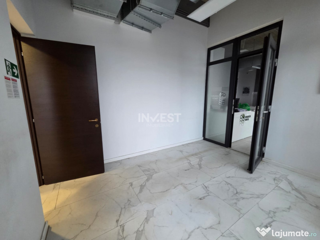 Al doilea spatiu are suprafata utila de 100 mp, acesta fiind compartimentat, avand 2 birouri individuale si o camera care poate servi ca sala de intampinare clienti.
