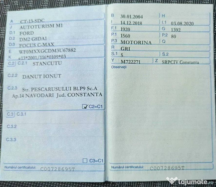 Vând Ford Focus C-Max, an 2004, motor 1.6 TDCi (1560 cm³) – 109 CP, cutie manuală. Mașina este înmatriculată în România, acte în regulă, proprietar în talon.