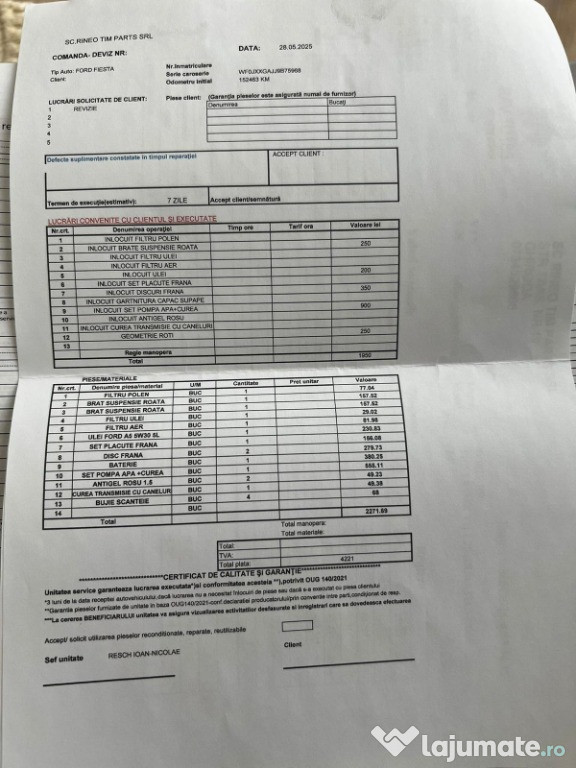 Ford Fiesta 1.25 benzina 82 CP 155000 kmMasina nu necesita nici o investitie(distributie,ulei,frane,baterie,filtre,toba) schimbate.