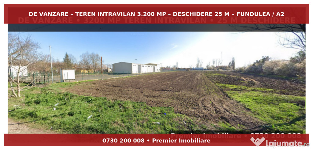 Premier Imobiliare – Agentia Fundulea va ofera spre vanzare un teren intravilan de 3.200 mp in Fundulea, amplasat langa Autostrada A2 (Autostrada Soarelui ) si foarte aproape de Gara CFR Fundulea, cu acces rapid si facil catre Bucuresti, la doar 25 de minute.Situat în Fundulea, într-o zonă mixtă care se dezvoltă rapid, terenul este potrivit pentru o gamă largă de proiecte: dezvoltări de locuințe, depozite logistice, hale industriale sau spații comerciale (service auto, showroom, sediu de firmă).