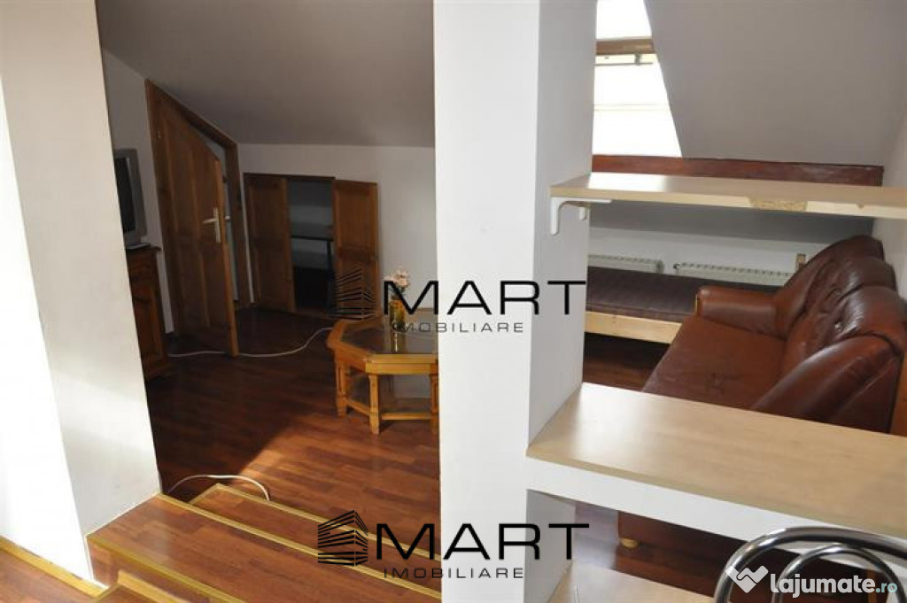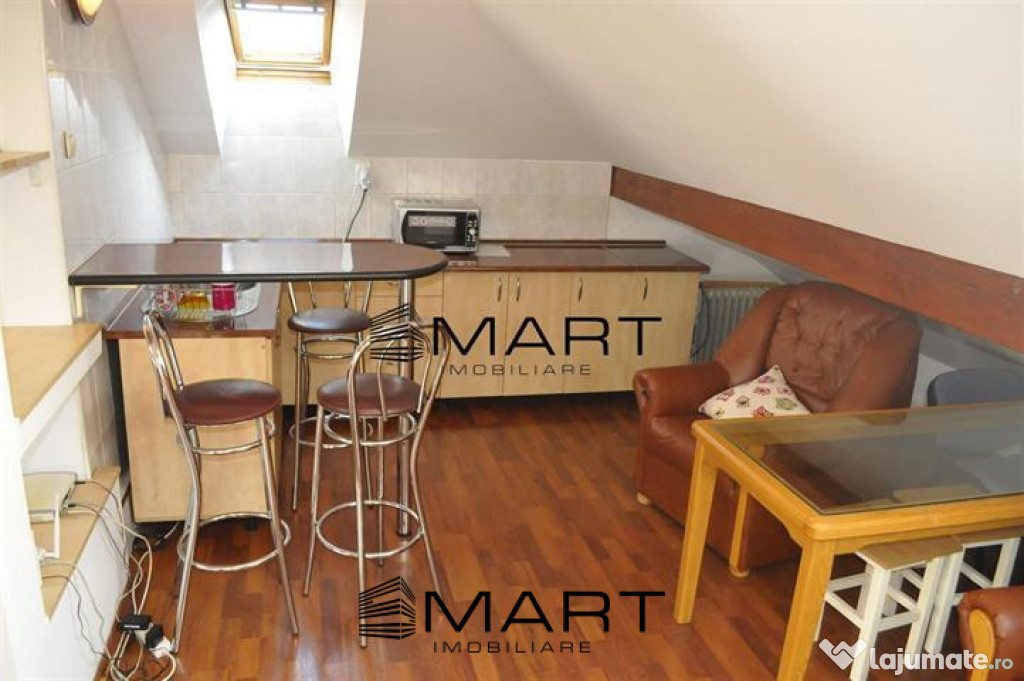 Smart Imobiliare propune spre inchiriere apartament situat la mansarda in zona Strand,in imediata apropiere de statii de taxi , magazine mijloace de transport in comun,facilitand astfel deplasarea catre toate punctele de interes din Sibiu. Garsoniera este compartimentata astfel: dormitor, bucatarie, loc pentru luat masa si baie. Apartamentul este mobilat, utilat.Precizati ca ati vazut anuntul cu ID: P2543