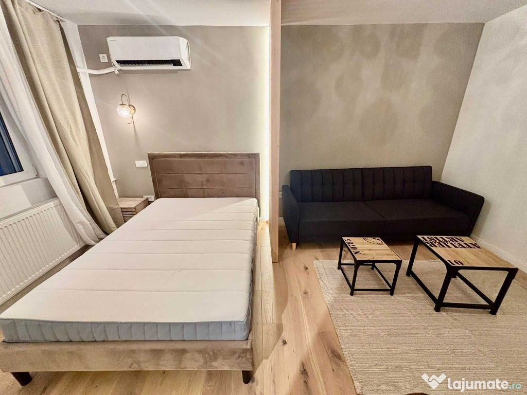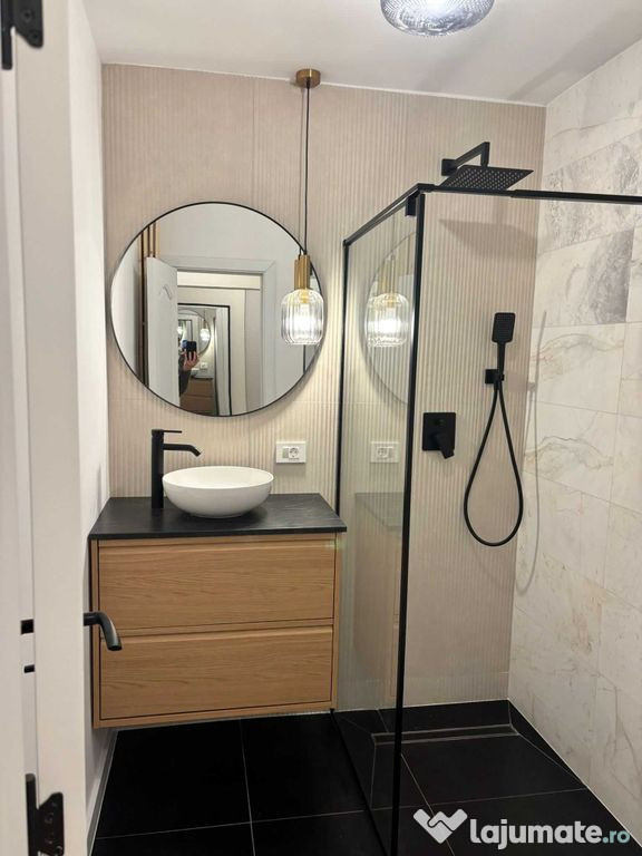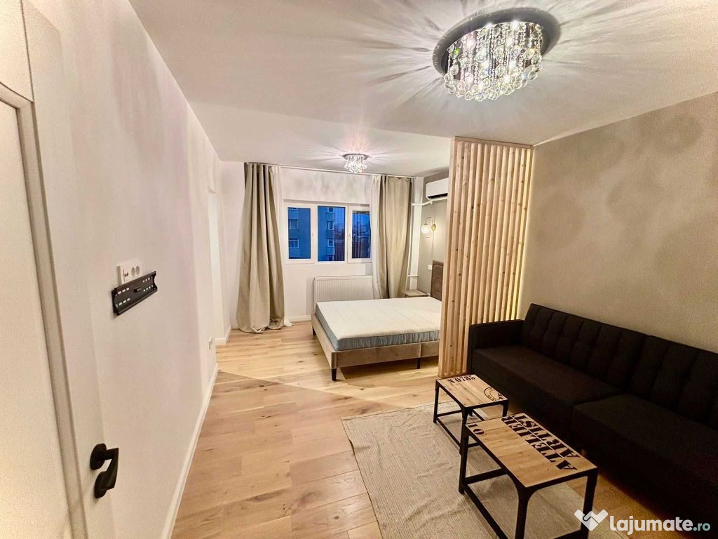Dispune de hol separat cu spații de depozitare, bucătărie închisă complet echipata, baie modernă cu duș walk-in și cameră luminoasă, compartimentată elegant prin riflaj din lemn.
