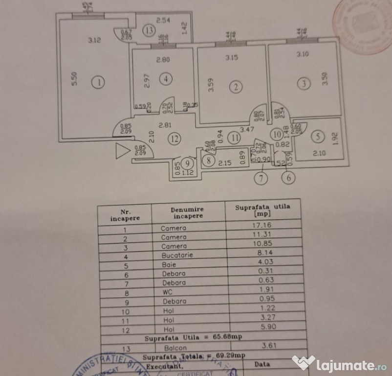 Suprafata toata la apartamentului este 69,29 mp. Are 3 debarale si este fara modificari in compartimentare.