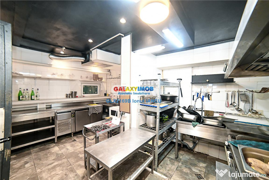 Spatiul este optimizat pentru operatiuni Horeca. Clientii sunt intampinati de un hol de primire cu zona de bar, care se deschide catre un salon spatios, ideal pentru a gazdui peste 100 de persoane la mese. Bucataria este complet echipata si respecta normele in vigoare, fiind prevazuta cu flux si reflux pentru un circuit operational eficient. Proprietatea beneficiaza de asemenea de o terasa, care adauga valoare afacerii, in special in sezonul cald.