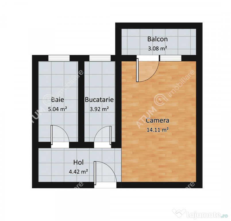Locuinta masoara 27,10 mp utili, acesta fiind formata la intrare dintr-un hol de acces amenajat cu pantofar si cuier, multiple spatii de depozitare, dormitor, bucatarie separata si balconul inchis in tamplarie PVC.