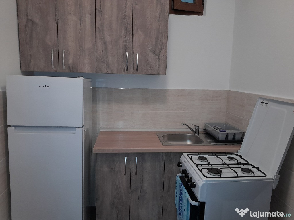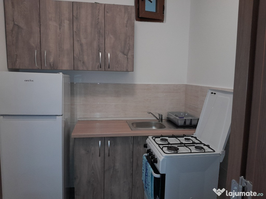 Garsoniera este mobilata:sifonier mare,canapea extensibila 1,40/2m,comoda,masa,si utilata:frigider,aragaz cu butelie,masina spalat,televizor