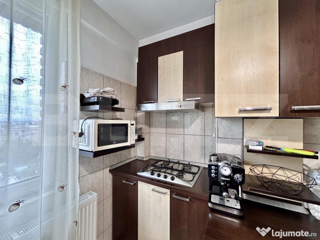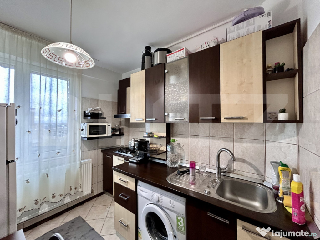 Bucătăria este eficient organizată, dispunând de mobilier modern în două tonuri (maro închis și bej), aragaz, hotă, cuptor cu microunde și chiar o mașină de spălat rufe integrată sub blat. Spațiul include și o zonă de luat masa.