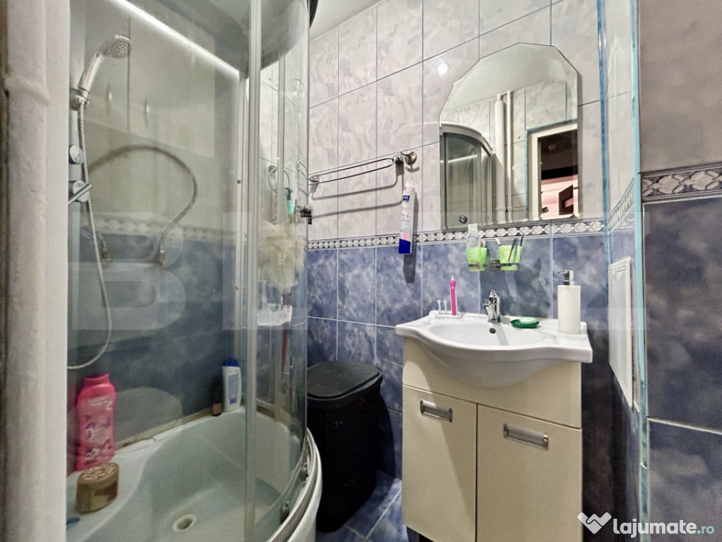 Baia este complet utilată, având cadă cu cabină de duș și mobilier de lavoar.