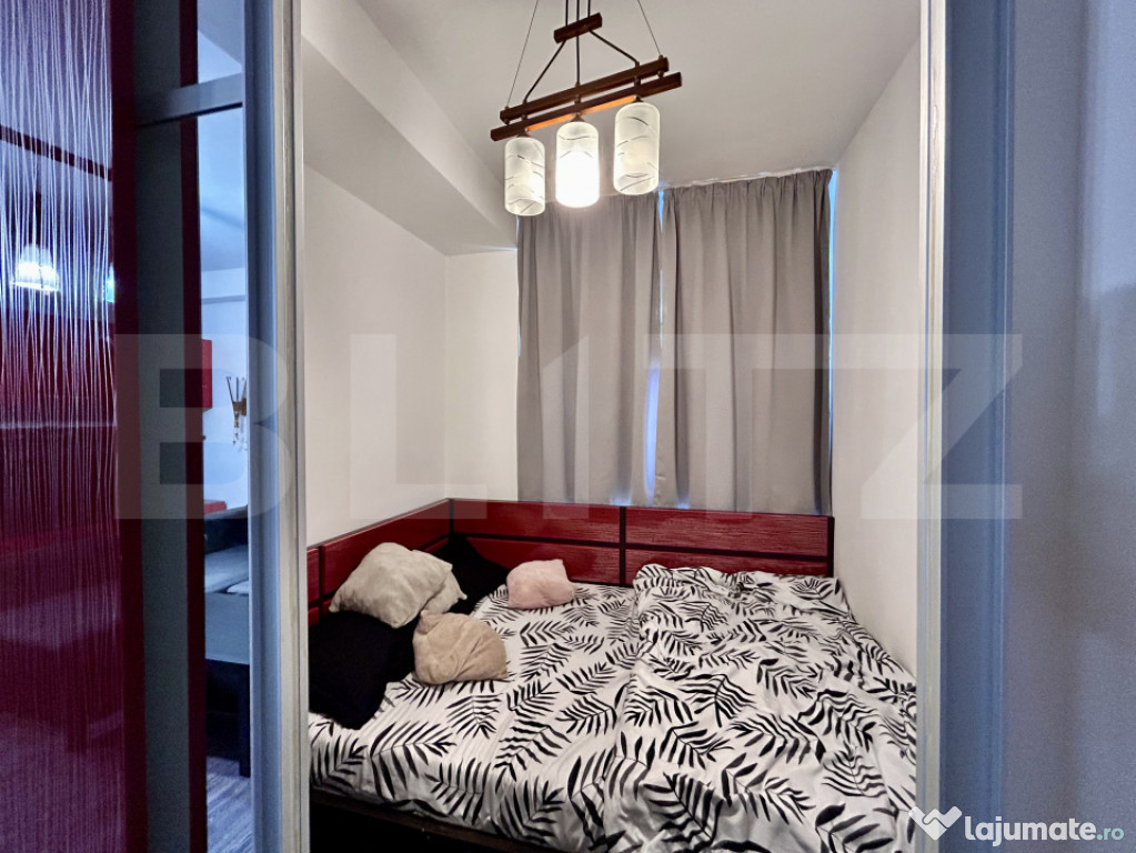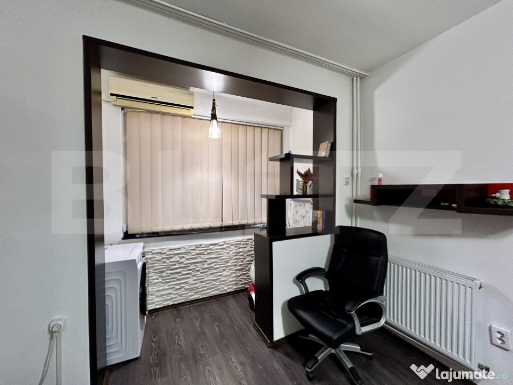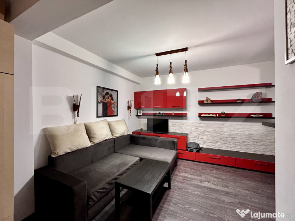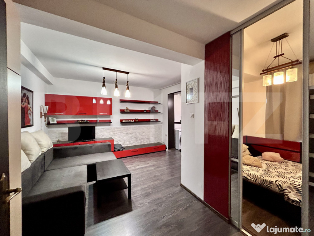 Te invităm să descoperi această garsonieră cochetă, gata să-ți devină acasă imediat, situată într-o zonă ultra-centrală și privilegiată din Ploiești. Cu o suprafață utilă de 34 mp, proprietatea a fost amenajată cu atenție la detalii, îmbinând funcționalitatea cu un design modern și atrăgător.Designul interior se remarcă prin jocul de culori vibrante, în special accentele de roșu intens din zona de zi, care se combină armonios cu nuanțele de alb, maro închis și bej deschis, oferind un spațiu plin de personalitate.