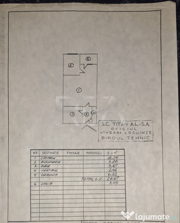 Garsoniera are o suprafață totală de 31,12 mp și se împart astfel: