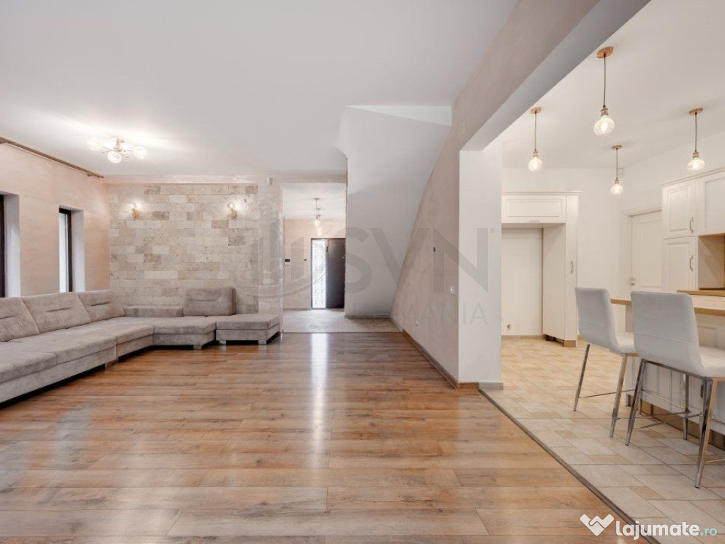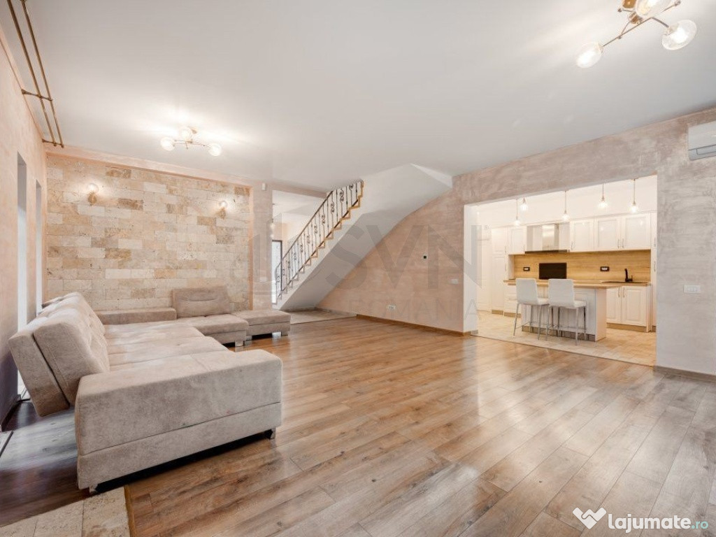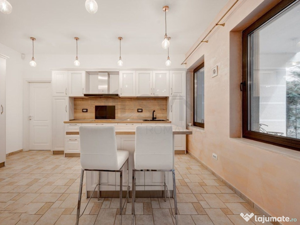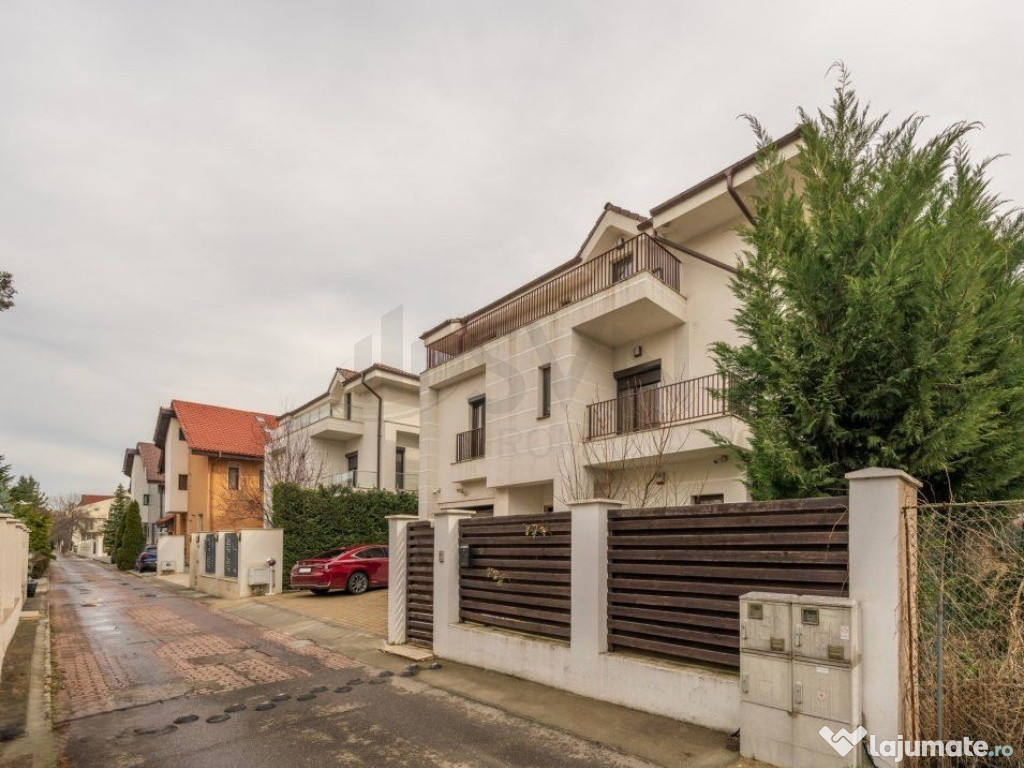 Cladirea este retrasa fata de bulevardul principal si face parte dintr-o strada privata cu vile individuale, fara asociatie de proprietari. Zona este matura, cu vecini de calitate. Locuinta are un aspect elegant, iar curtea, usor de intretinut, cu vegetatie si arbori inalti, ofera un cadru relaxant.
