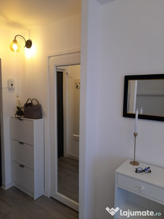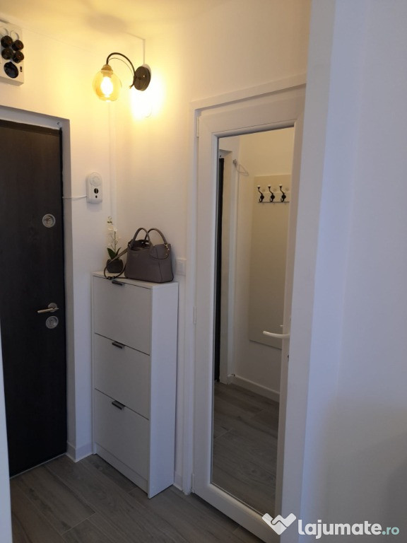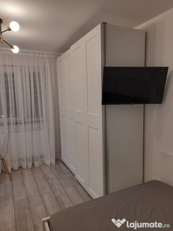 Hol intrare cu pantofar, oglinda, cuier, baie cu cabina dus si ventilator, camera cu pat matrimonial, noptiera, sifonier, dressing spatios cu 2 usi duble glisante, masa tip birou, scaun birou, TV LCD, rafturi pentru carti, AER CONDITIONAT, bucatarie inchisa, mobilata pe comanda cu dulapuri cu blat si dulapuri suspendate, combina frigorifica, masina de spalat rufe, plita, hota, cuptor electric, etc. Cablu si internetul deja trase doar de deschis partida cu ce furnizor se doreste. Garsoniera luminoasa, are vedere către grădina blocului, oferindu-ți liniște și un cadru plăcut atunci când te întorci acasă. Este locul unde funcționalitatea se îmbină cu atmosfera caldă de ACASA.