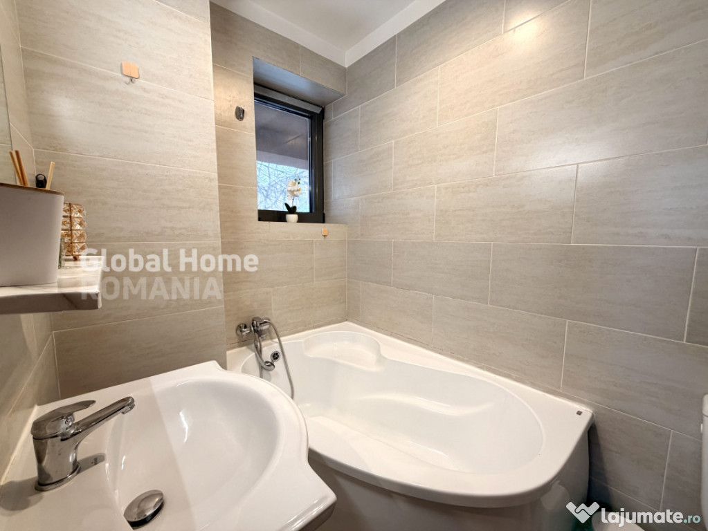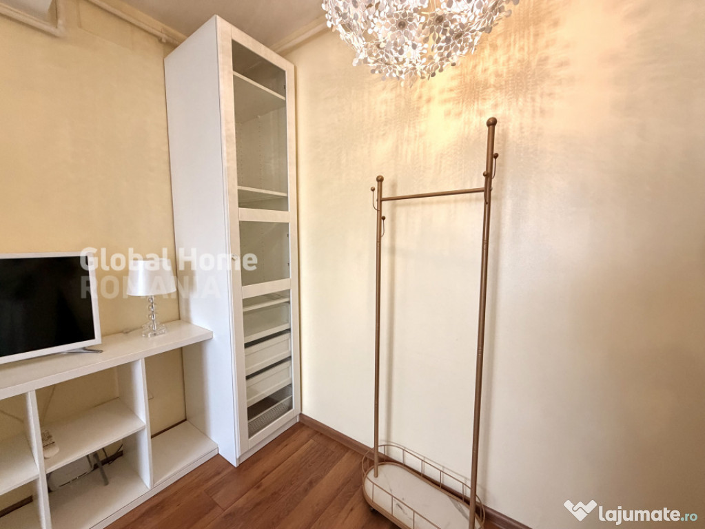 Garsoniera este complet mobilată și utilată, cu zonă de zi generoasă, spații de depozitare bine integrate și bucătărie funcțională. Bucătăria este echipată cu plită, hotă, mașină de spălat rufe și frigider, iar zona de living beneficiază de aer condiționat și lumină naturală din plin. Baia este dotată cu cadă și finisaje neutre, ușor de întreținut.