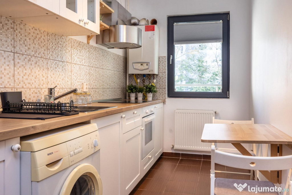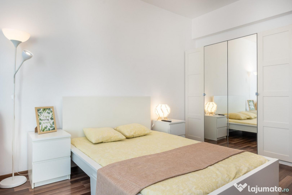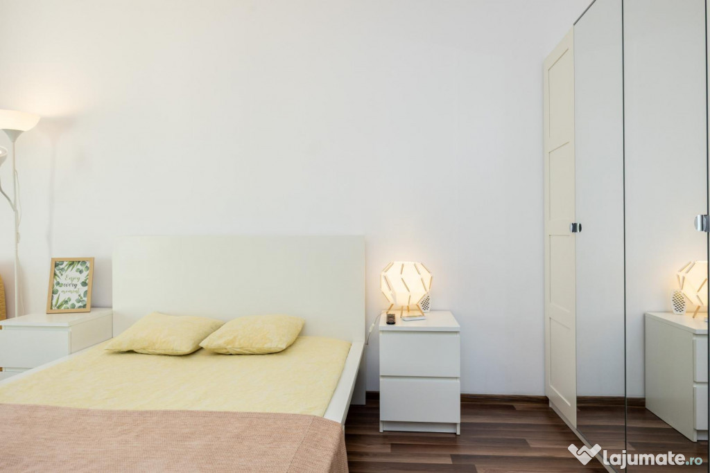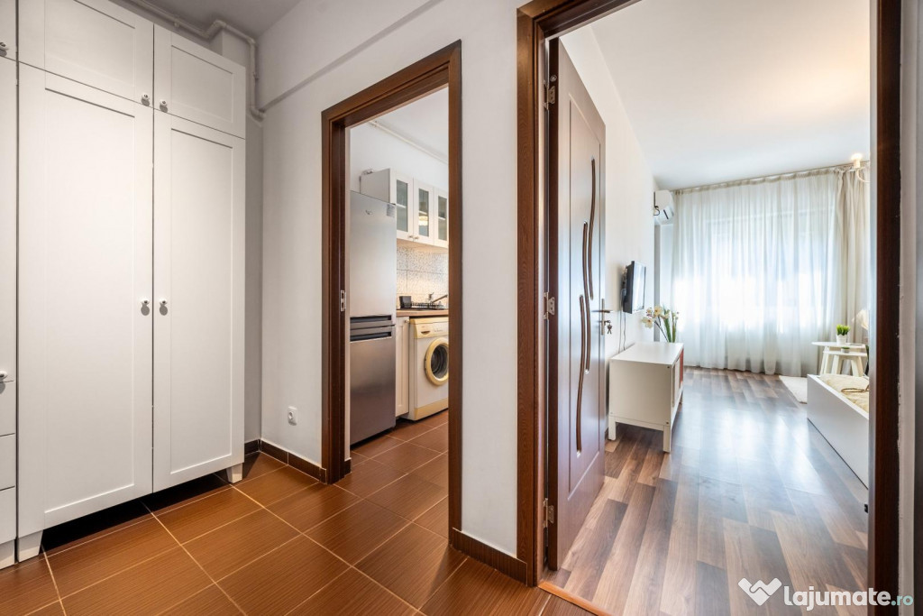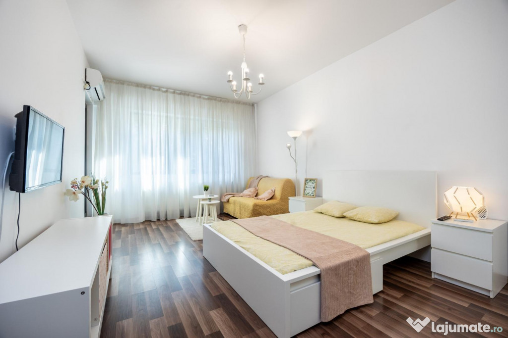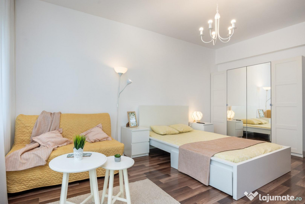 Garsoniera este decomandata, bucataria este inchisa. Vei avea la dispozitiei atat un pat confortabil, cat si o canapea extensibila si multe spatii de depozitare generoase.