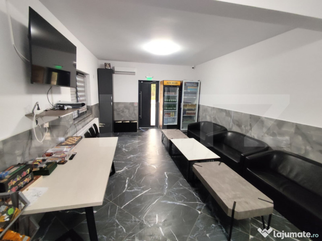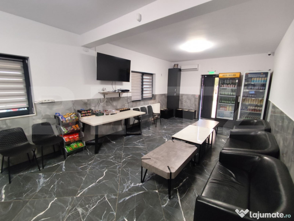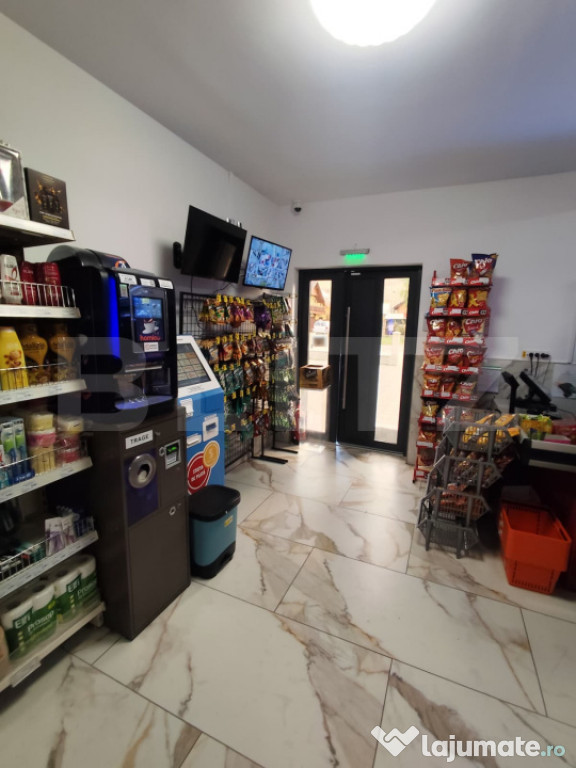 Parter: magazin si bar, ambele functionale, complet echipate si utilate, 3 bai, vestiar pentru personal, camera tehnica , magazie, terasa 60 mp lateral, 60 mp in spate si parcare 140 mp;