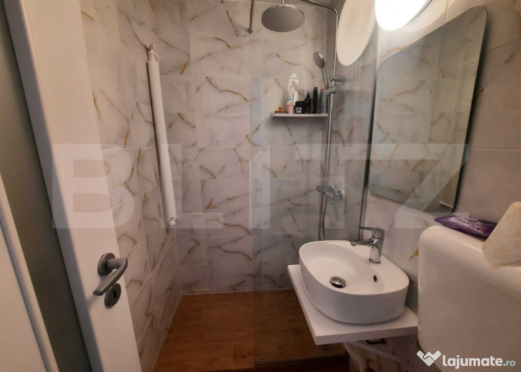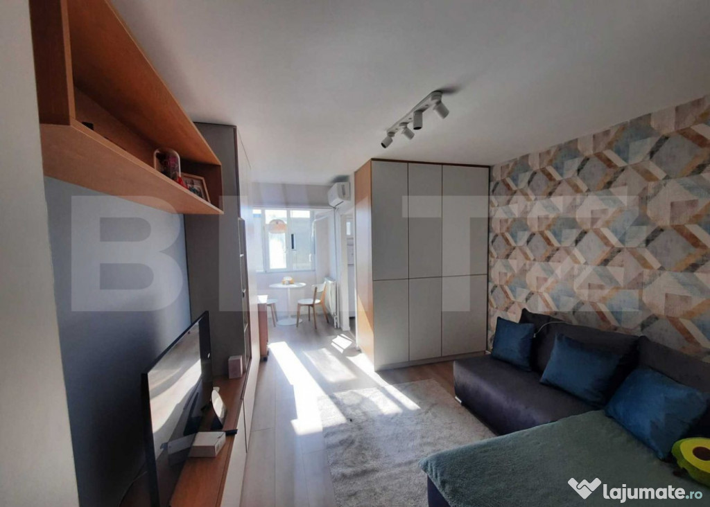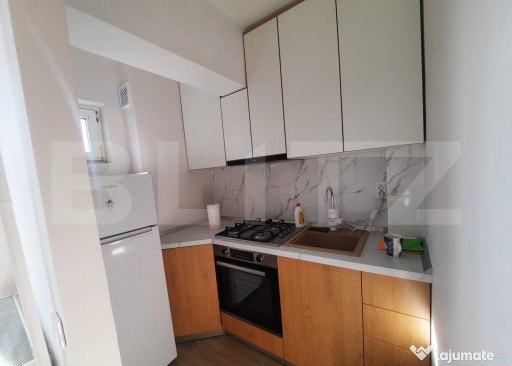 Garsonieră modernă de închiriat – complet utilată, 10 min de PalasBlitz ofera spre inchiriere o garsonieră spațioasă și luminoasă, complet mobilată și utilată cu electrocasnice noi: plită pe gaz, cuptor electric, boiler, A/C, mașină de spălat, uscător, TV . Etaj 4/4 cu pod.