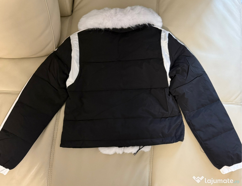 Geacă fashion de iarnă, nouă cu etichetă, în nuanțe elegante de alb și negru, perfectă pentru un look modern și rafinat.Are guler amplu din blană artificială moale, fermoare metalice și croială cambrată, care pune frumos în evidență silueta.