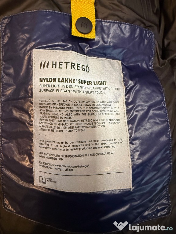 Nu a fost purtată niciodată. Elegantă și tehnică, această geacă hidrofugă, îmbină măiestria Italiană cu peste un secol de experiență în producția de puf de gâscă a Hetregó. Mărimea este potrivită pentru M și pentru L. Compoziția este 90% puf de gâscă și 10% pene, iar materialul exterior este un nylon lakké super ușor de 15 denieri. Gluga este detașabilă pentru versatilitate, are finisaj hidrofug și este concepută pentru a ține cald.Made in Italy.