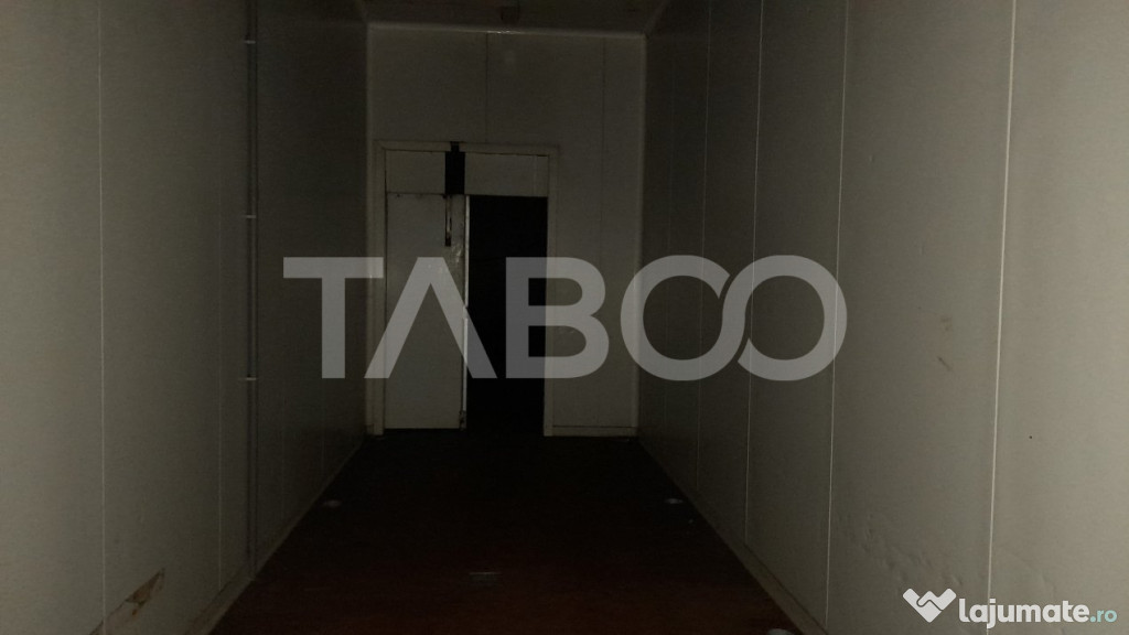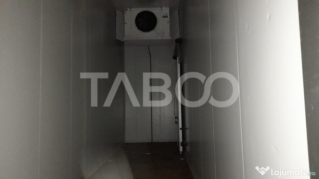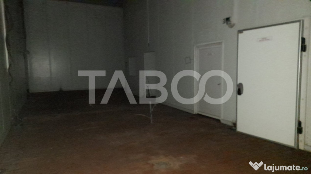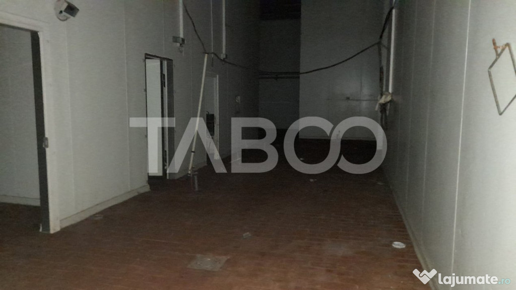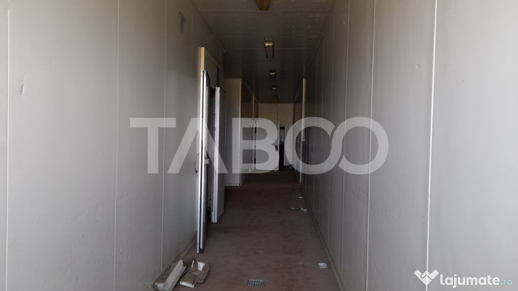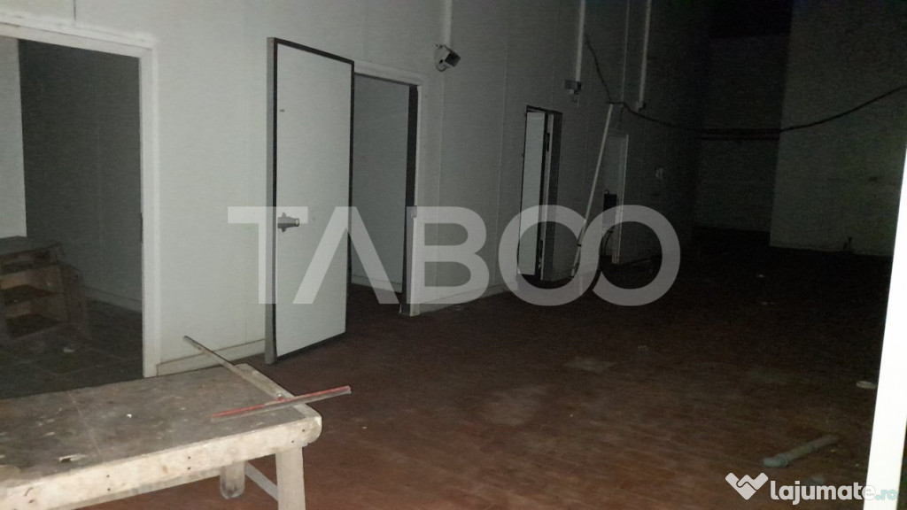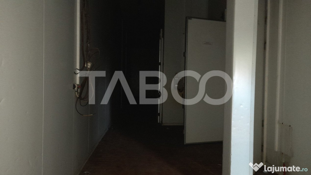 Hala industriala de inchiriat in zona Veterani Sibiu, cu 1164 mp utili compartimentati in spatiu de productie de 970 mpu si spatiu de birouri de 194 mp utili si teren aferent de 1000 mp. Extra se poate inchiria un al doilea corp de cladire cu 374 mpu si mai mult teren aferent pana la suprafata maxima de 5600 mp.Aceasta este prevazuta cu camere frigorifice pentru productie, insa se poate inchiria si compartimentata open-space.