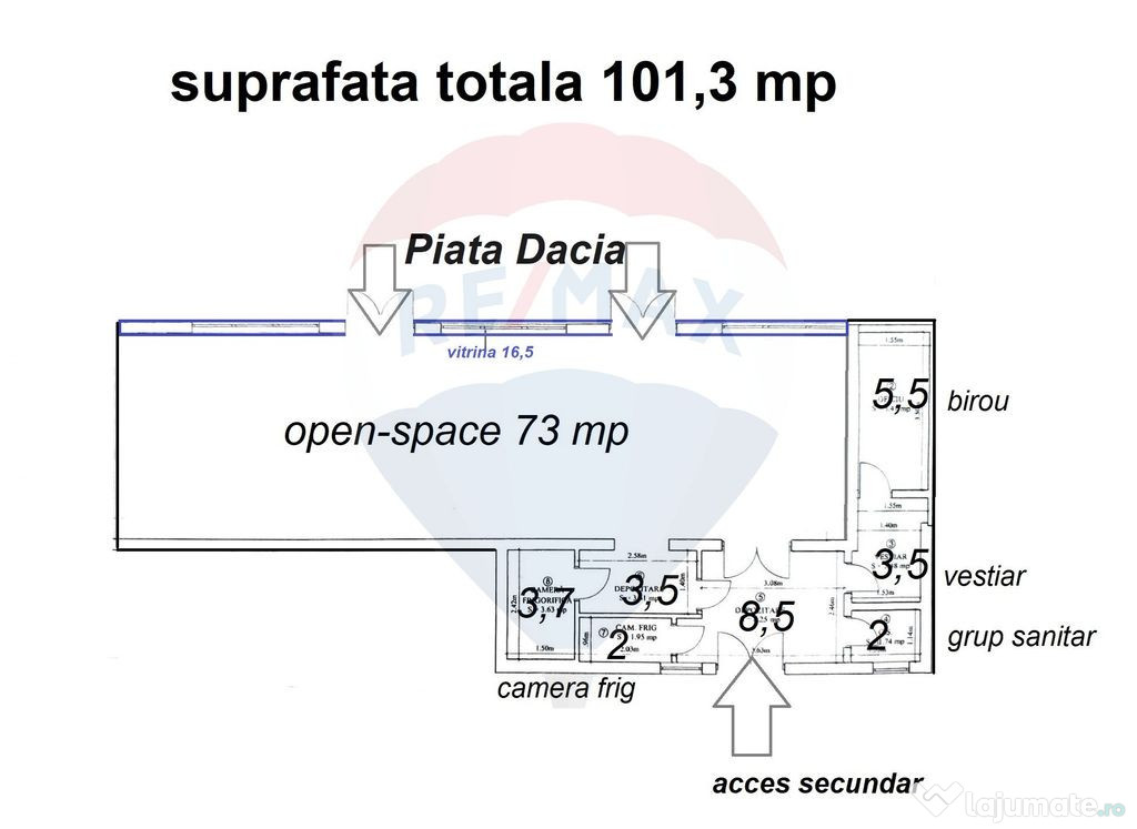 · Suprafață Totală: 101,3 mp, compartimentați funcțional pentru eficiență operațională.