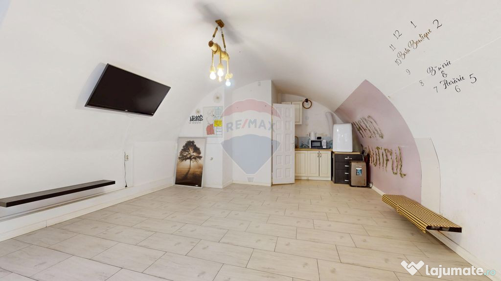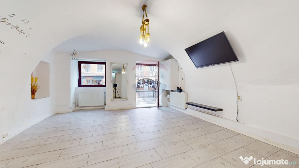 Spațiul este configurat open-space și beneficiază de o deschidere de 4,6 metri cu acces direct din stradă. Un element de design distinctiv este plafonul boltit, care conferă un farmec aparte și o atmosferă specială, perfectă pentru a atrage și fideliza clienții.