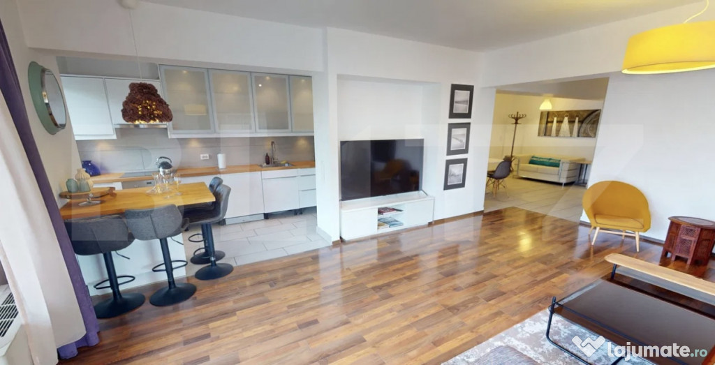 Apartamentul este complet mobilat și utilat, amenajat cu mult bun gust în stil modern, fiind ideal pentru un cuplu sau o familie, inclusiv cu copii.