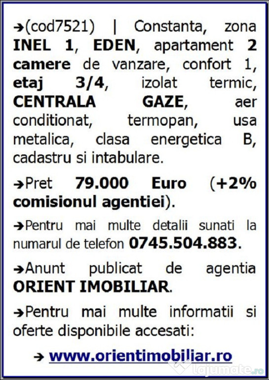 (cod7521) | Constanta, zona INEL 1, EDEN, apartament 2 camere de vanzare, confort 1, etaj 3/4, suprafata 46mp cu balcon, izolat termic, CENTRALA GAZE, aer conditionat, termopan, usa metalica, clasa energetica B, cadastru si intabulare.Pret 79.000 Euro (+2% comisionul agentiei).