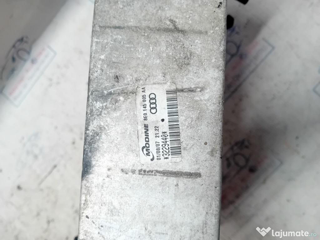 Intercooler Audi A4 2007. Cod(uri): 8E0145805AA, 3229440. Piesele comercializate sunt originale, provenite din dezmembrari. Dispunem de o gama larga de piese multimarca. Piesele sunt verificate inainte de a fi puse spre vanzare. In caz de neconformitate piesa se poate returna. Va rugam sa verificati disponibilitatea pieselor telefonic. Trimitem in tara prin curier.Marcă: Audi