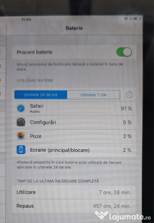 iPad de generatie veche actualizat la versiunea 9.3.5 (13G36) ultima versiune pentru configuratia lui.bateria se prezinta foarte bine avand in vedere vechimea lui, singurul lui defect vizibil este o lovitura la coltul de jos stanga dar nu este spart ecranul si nu afecteaza cu nimic functionarea.