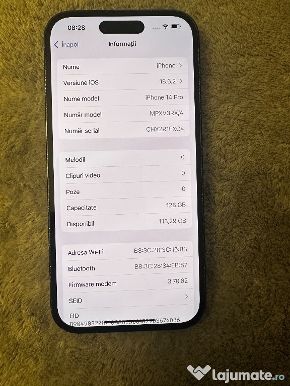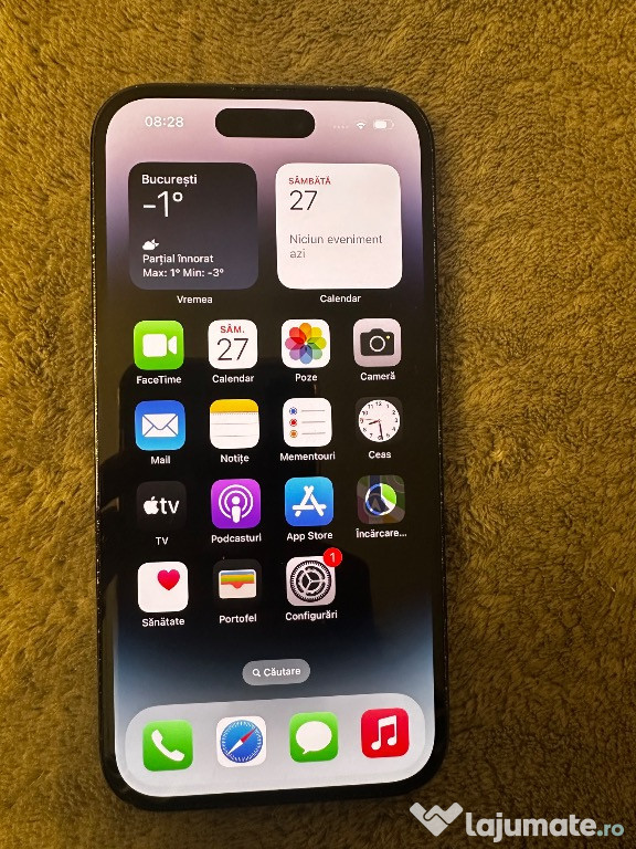 Vand iphone 14 Pro 128GB 80% baterie sanatate este originala nu este schimbata telefon personal luat din magazin nou se vinde cu fir original si cutia lui originala nu are nici un defect nu este zgariat nici fata nici spatele doar lateralele usoare semne de uzura de la husaAnuntul Iphone 14 Pro este adaugat de pe LaJumate.ro.