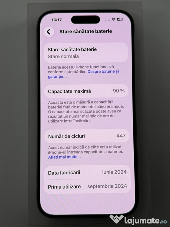 Vand iPhone 15 pro 128gb. Stare ca nou. Sanatatea bateriei este de 90% . Cumparat anul trecut in sept ...
