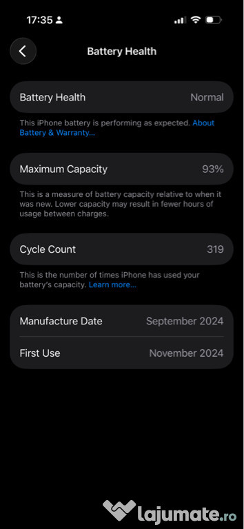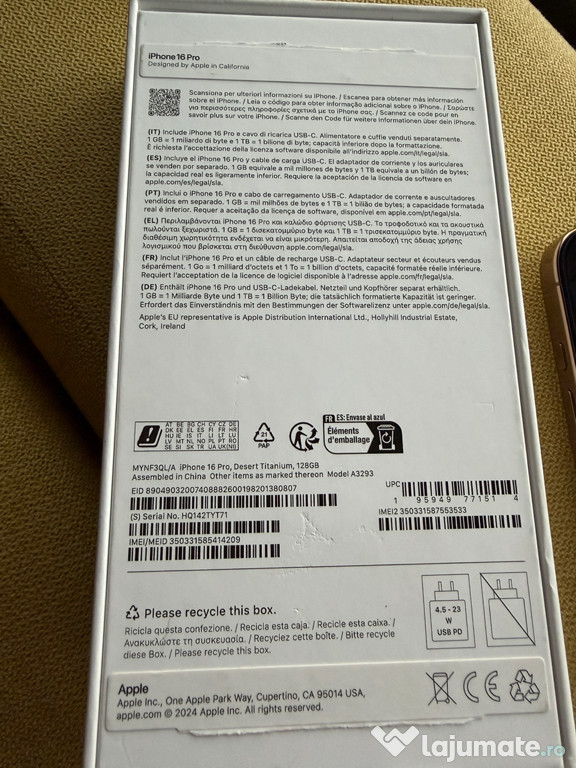 Este in starte excelenta atat estetic cat si tehnic. Nu are niciun fel de probleme, nici nu a avut. Il vand deoarece l-am inlocuit cu modelul nou. E activat acum un an. 94% sanatatea bateriei. Are folie de sticla pe ecran. Nu accept schimburi. Predare personala in Cluj-Napoca si imprejurimi.Anuntul IPhone 16 pro 128gb Desert Titanium este adaugat de pe LaJumate.ro.