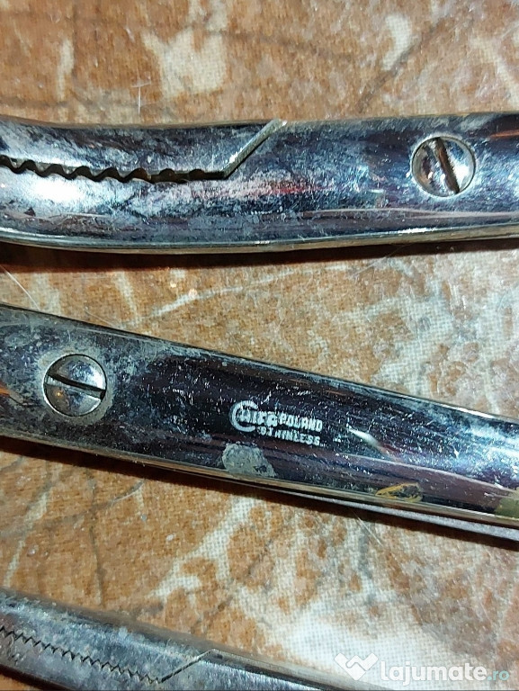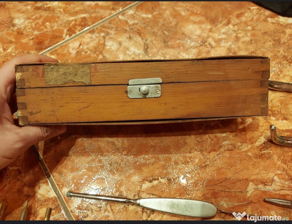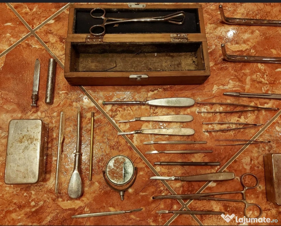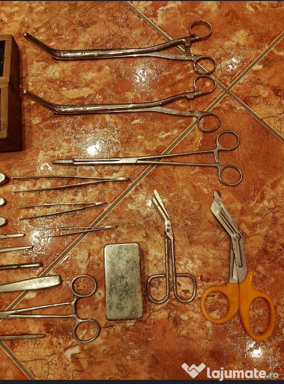 Multe ustensile instrumente medicale spital vechi din comunism vintage foarfeci bisturii cutite pensete cutiute oglinda cutie lemn si etcFirma romaneasca ITM