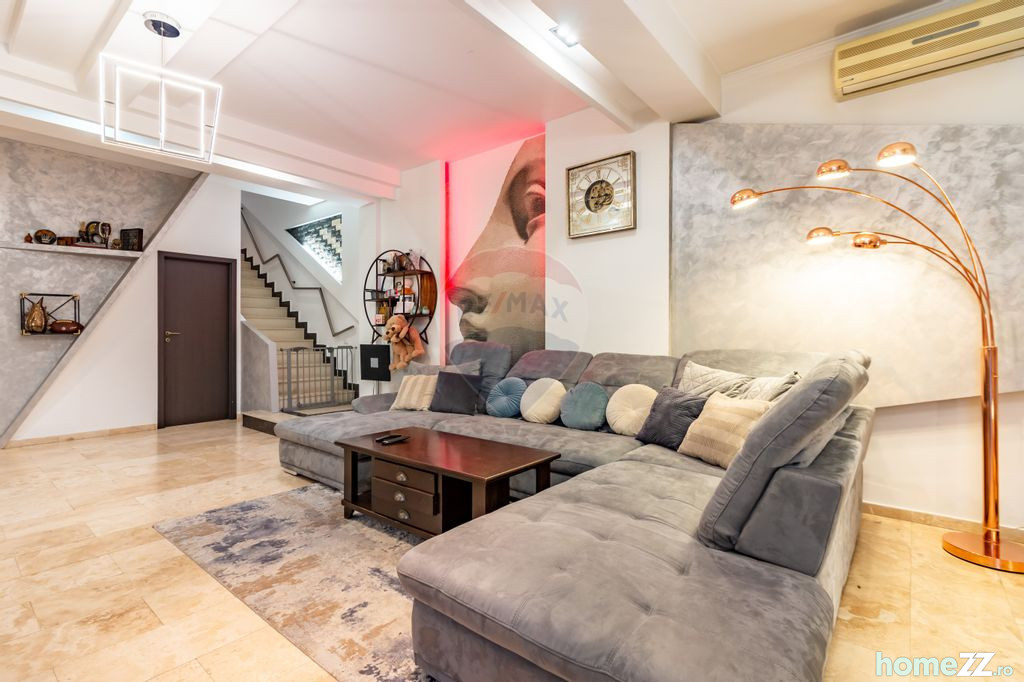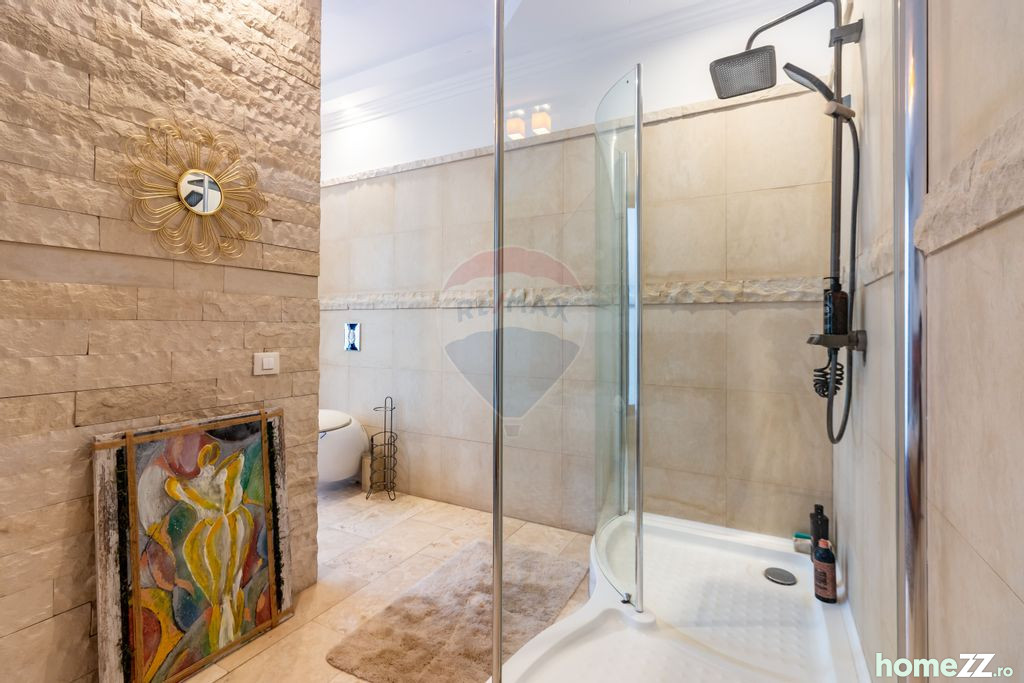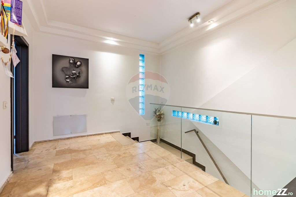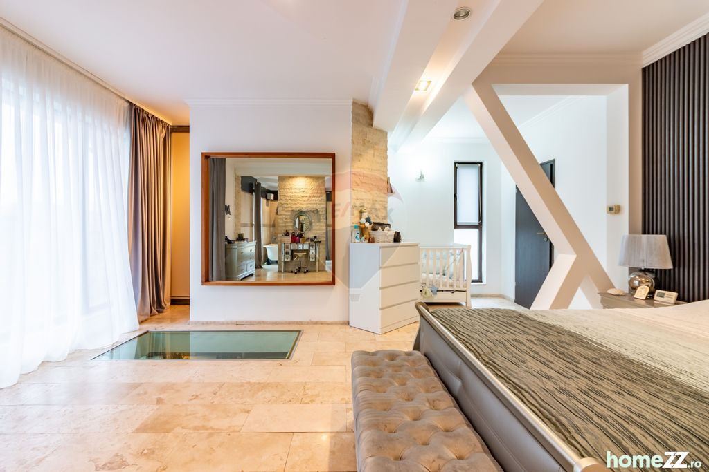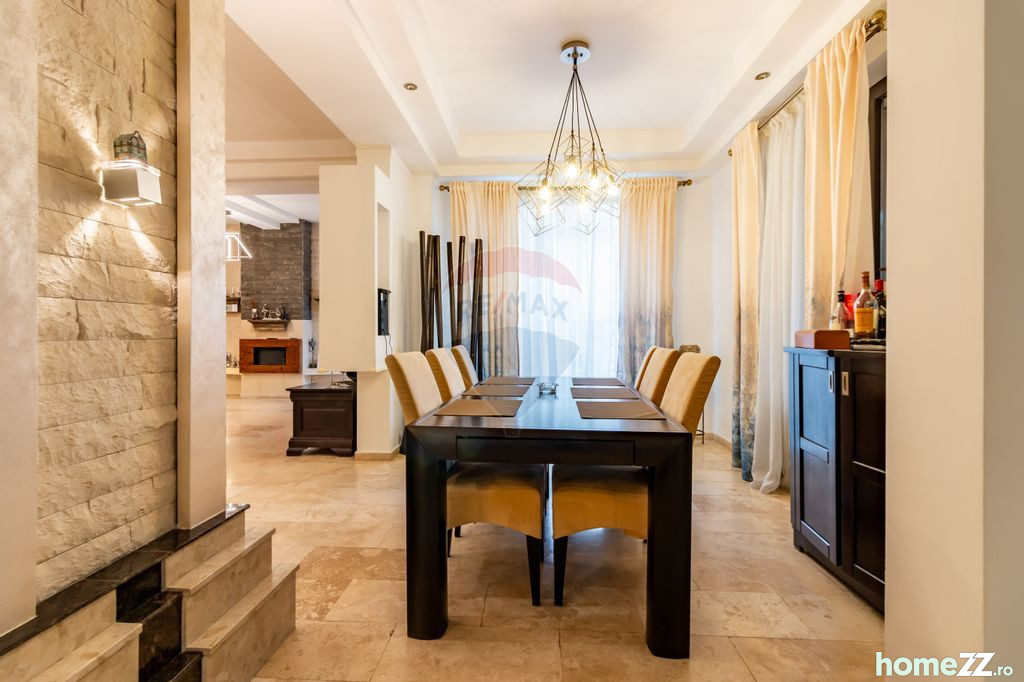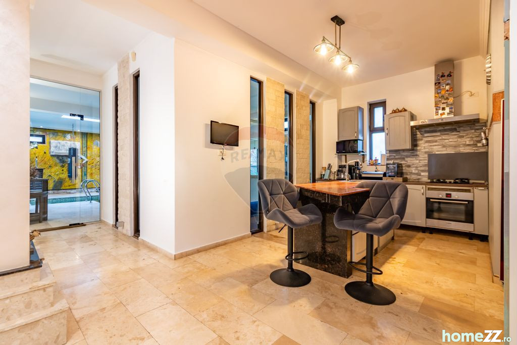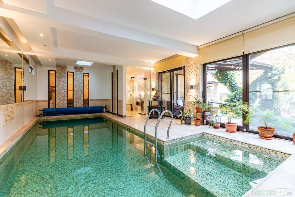 Fiind impartita pe P+E, la parter avem parte de un living spatios cu o bucatarie deschisa, baie de serviciu, camera tehnica si zona de relaxare cu piscina interioara incalzita, zona de jacuzzi, spatiu pentru sala de fitness si un bar gata amenajat.