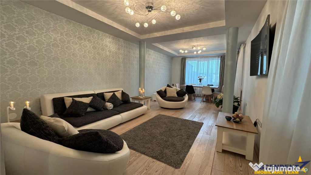 Livingul radiant este amenajat cu parchet din stejar masiv, canapea confortabila, doua fotolii si o masa de dining din acelasi lemn nobil. Atmosfera este completata de un televizor Samsung Curved cu camera integrata, ce aduce un plus de tehnologie si rafinament.