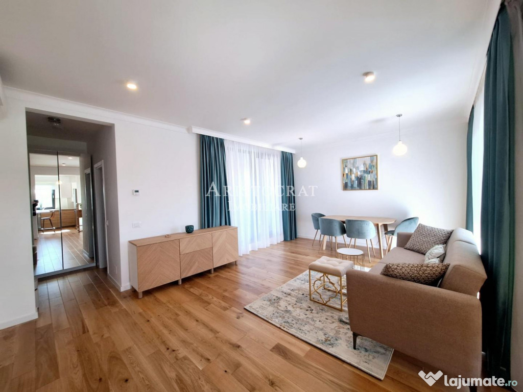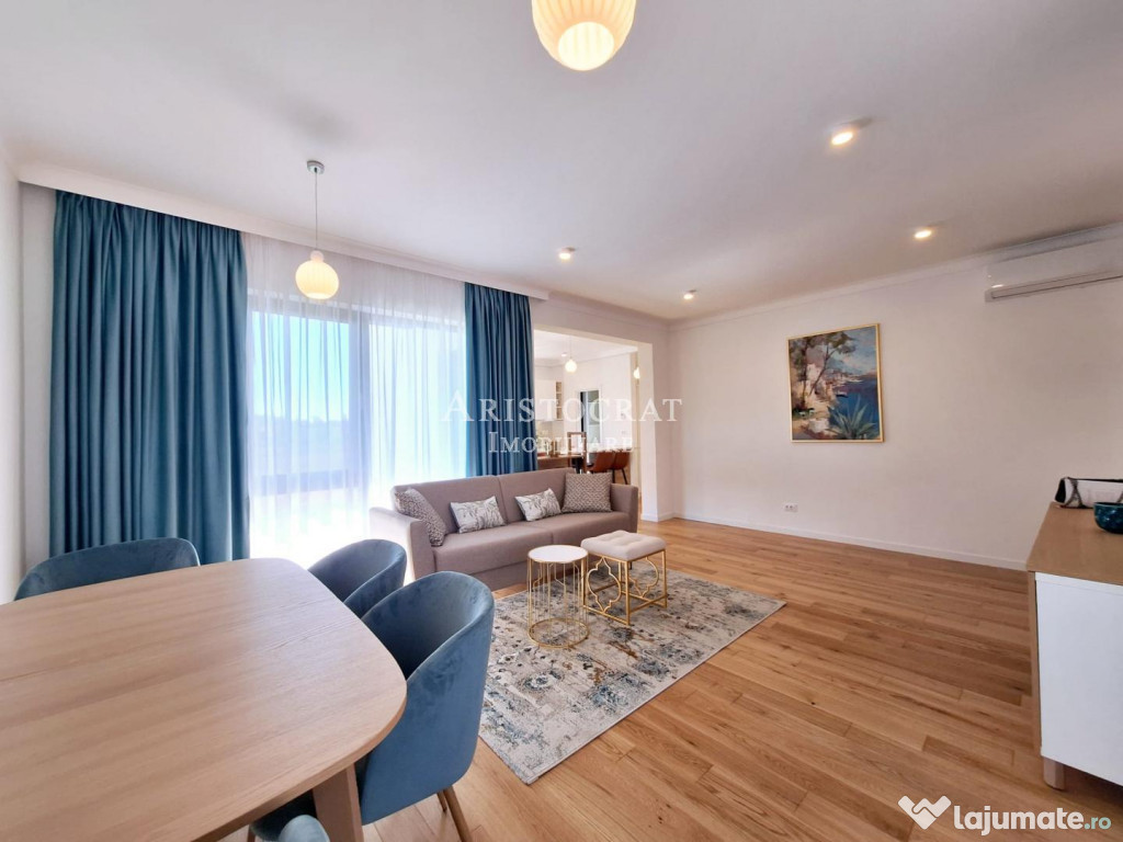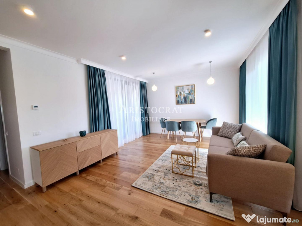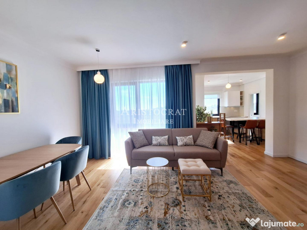 Aristocrat Imobiliare va propune spre inchiriere un apartament modern, complet mobilat si utilat, compus din 3 camere( 2 dormitoare) , 2 bai, etaj 1/ P 2, supr. utila 95mp, supr.construita 110mp.Apartamentul, amplasat intr-un complex rezidential bine manageriat si pozitionat in zona Corbeanca, este compartimentat astfel :