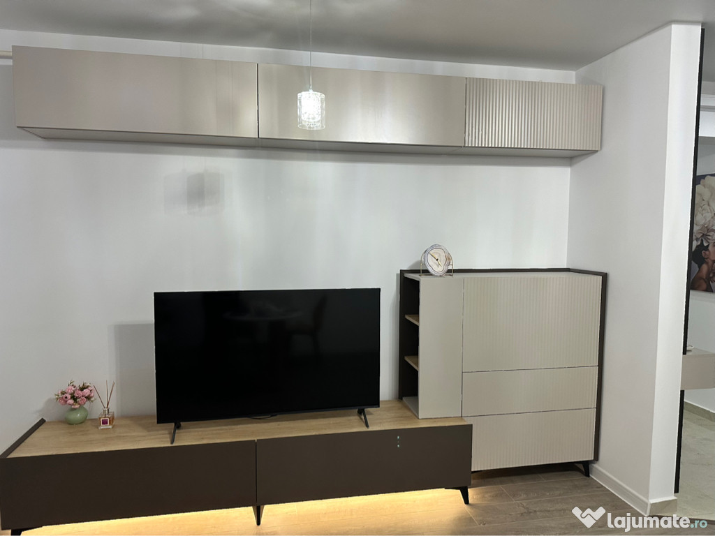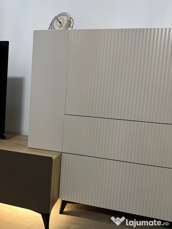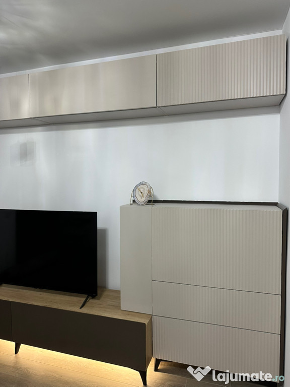 Mobilier de living, în stare bună de utilizare. Include dulapuri, rafturi, sertare, bar și un suport ...