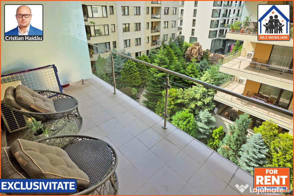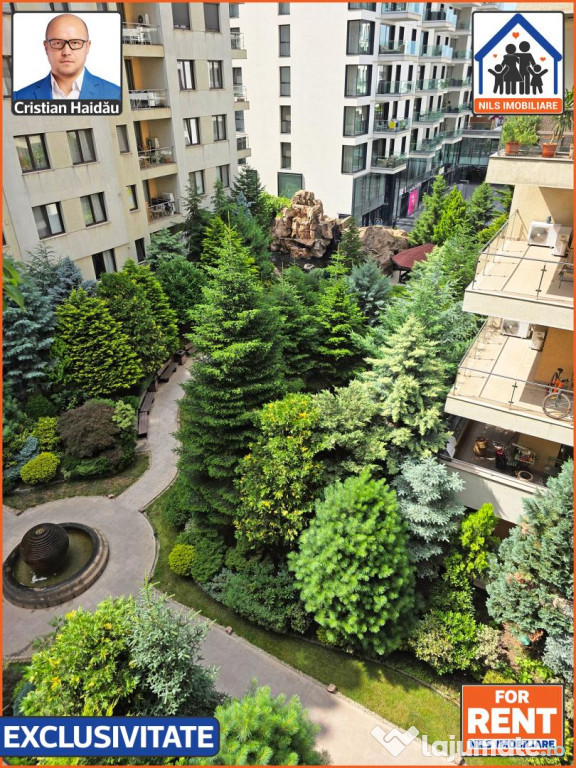 Inchiriere apartament 2 camere in prestigiosul complex rezidential North Area Lake View, din exclusivistul cartier Herastrau–Aviatiei, Sector 1. /Apartamentul beneficiaza de o priveliste rarisima catre probabil cea mai frumoasa gradina interioara din Bucuresti – o veritabila oaza de vegetatie in stil japonez, amenajata cu rafinament. Gradinile includ un spectaculos iaz cu pesti exotici koi si broaste testoase, cascade artificiale, foisor din lemn, alei discrete cu banci de relaxare si vegetatie luxurianta: pini, brazi argintii, tuia, ierburi ornamentale etc. /