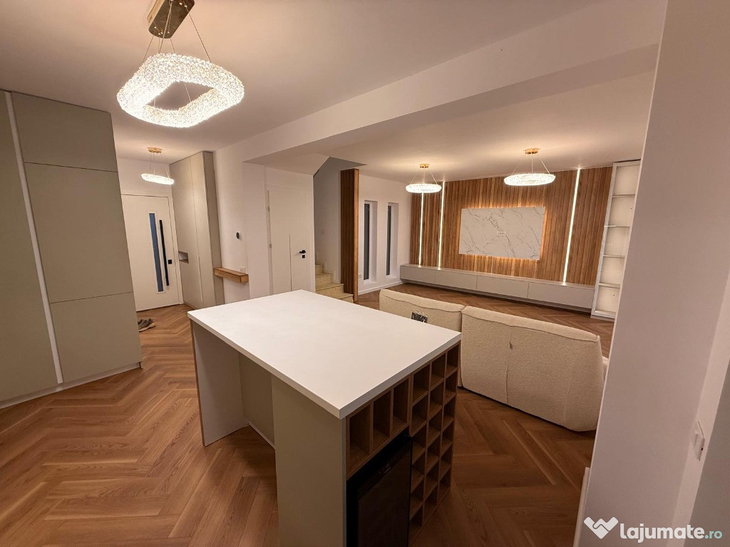Interioare: Centrală termică, încălzire în pardoseală, instalație electrică completă, uși interioare, gresie și faianță premium, parchet elegant, obiecte sanitare de calitate, scări cu balustradă, iluminat ambiental și tavane finisate impecabil.