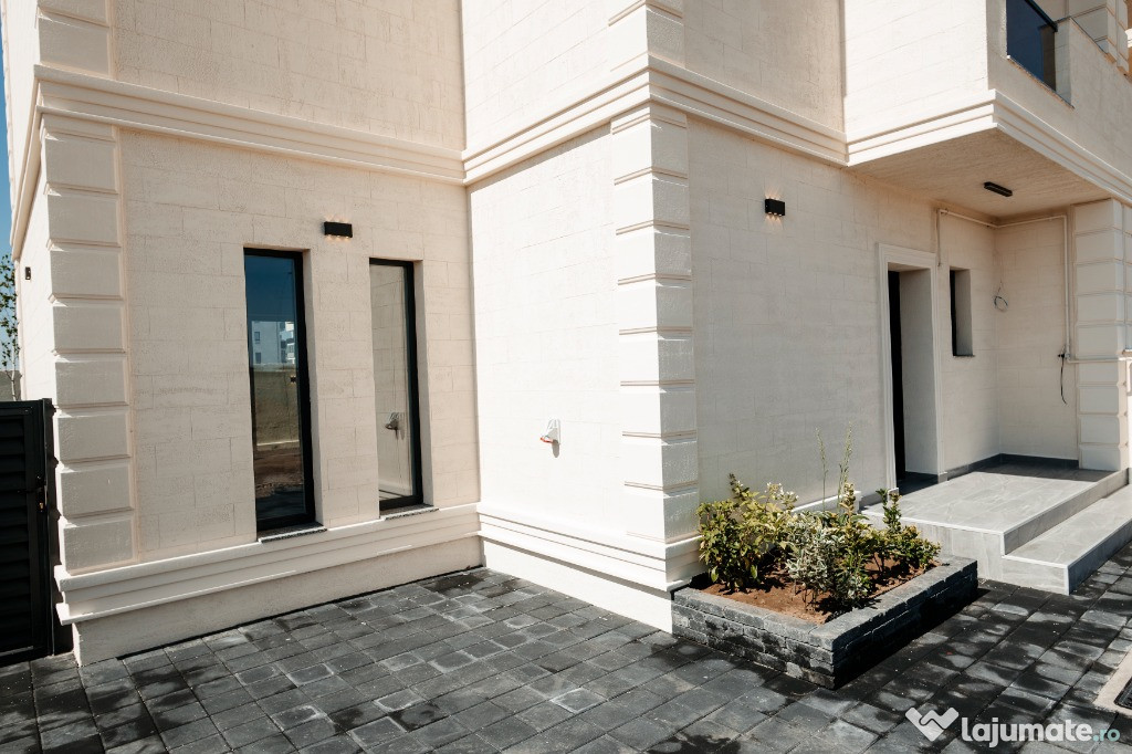 Exterioare: Beton, fier, cărămidă, izolație termică, fațadă cu termosistem, lavabilă de calitate superioară, tâmplărie tripan, ușă exterioară, acoperiș elegant, balustrade moderne, iluminat exterior, pavaj, locuri de parcare, amenajare grădină și garduri.