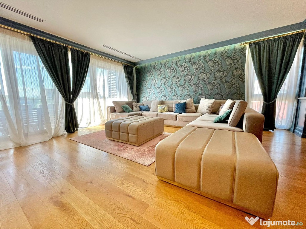 Apartament de lux cu 4 camere, situat la etajul 4 din 6 al unui imobil elegant de pe Șoseaua Nordului nr. 94X, una dintre cele mai exclusiviste adrese din București, chiar lângă Parcul Herăstrău.Proprietatea oferă o compartimentare generoasă și echilibrată, cu o suprafață utilă totală de 139 mp, la care se adaugă o terasă de 14 mp, rezultând o suprafață totală de 153 mp.