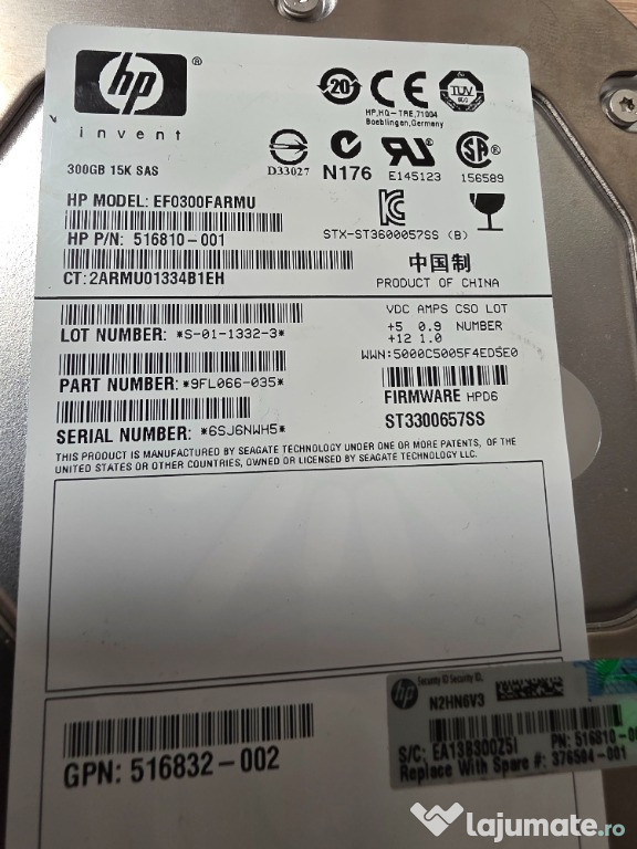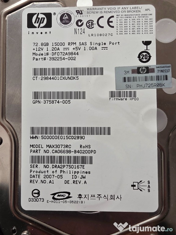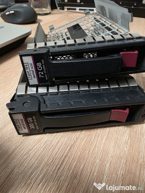 lot hdd HP 2x72.8 Gb si 4x300 Gb, Hdd dedicate server. Performance: Faster access times and higher data transfer rates, with spin speeds of \(10,000\) or \(15,000\) RPM.Reliability: Built for 24/7 operation with higher Mean Time Between Failures (MTBF), often \(1.6\) million hours or more.Features: Supports dual-porting for redundancy and higher throughput, and includes end-to-end data protection.Use cases: Ideal for demanding enterprise applications like transactional databases, hosting virtual machines, and high-performance computing. Se vand toate o data lot ! pret in euro 150 .Anuntul Lot HDD uri HP SAS este adaugat de pe LaJumate.ro.